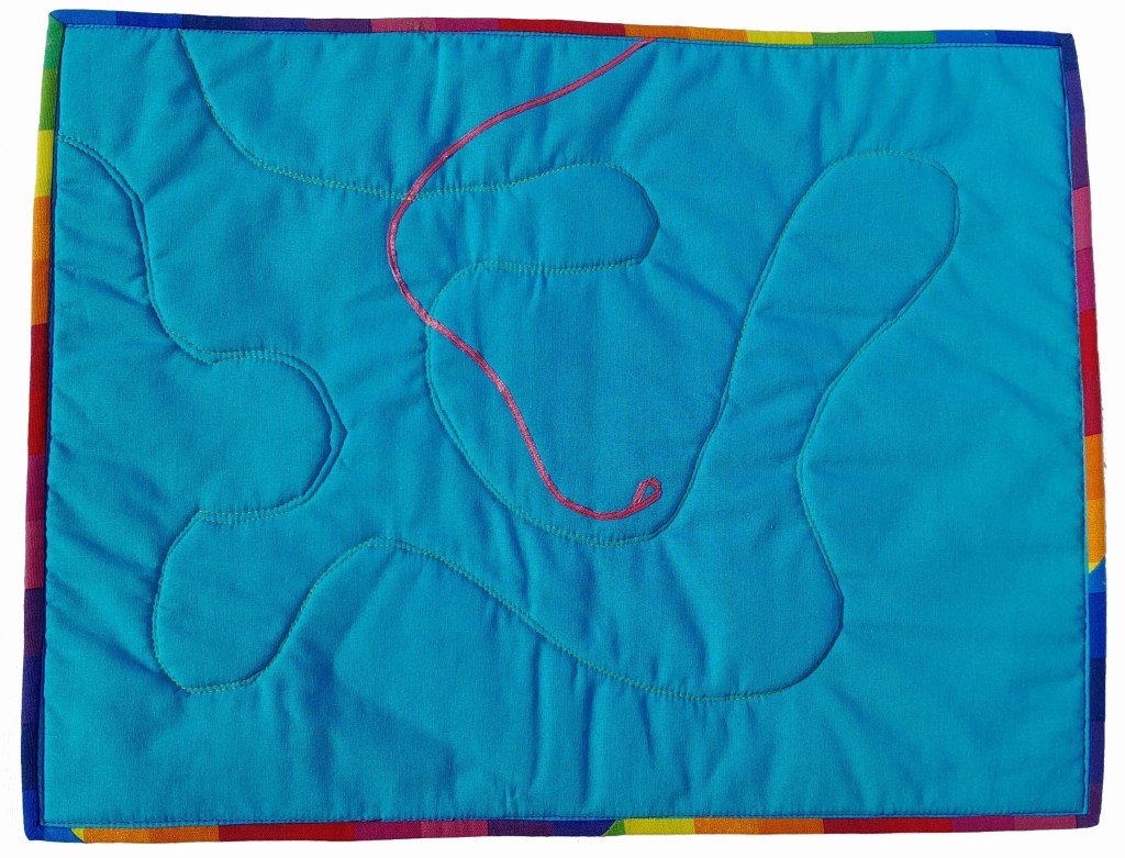 - Pin the cord in place, having a meandering path (see back of quilt). Stitch with either zig zag or two rows of straight stitching.