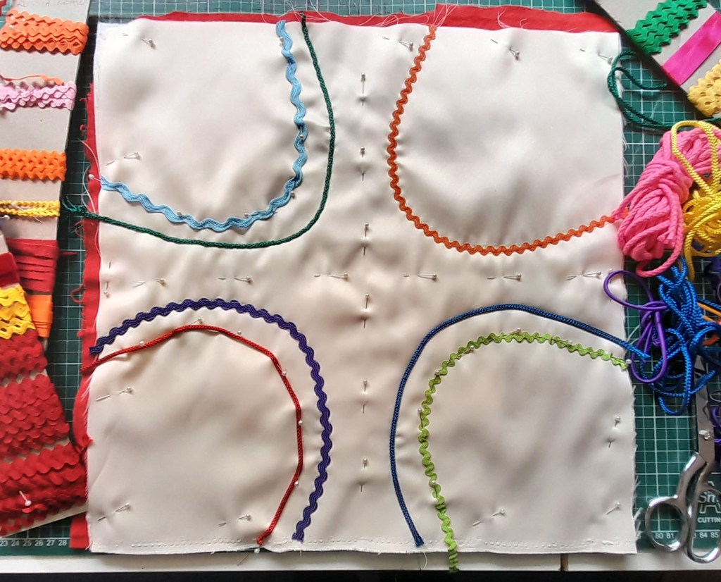 - Pin the four biggest arcs in place. I do this by eye (as they are mean to be wonky), keeping them about 2cm from the centre lines. Stitch in place. The “empty” space is for play.